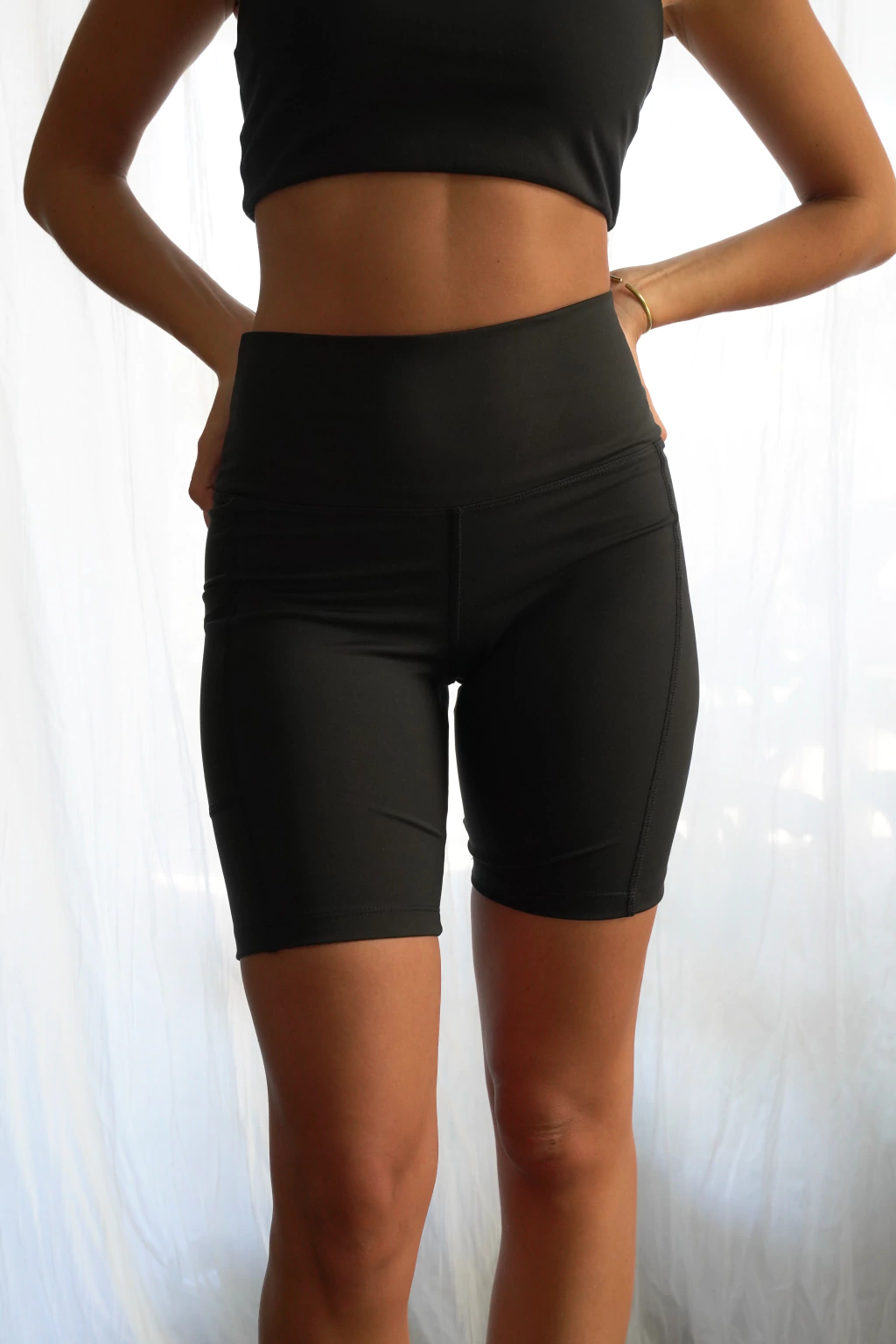 Calza biker (por encima de las rodillas) con cintura alta, sin elastico pero super sujetadora. Bolsillo lateral con detalles de bordador.
